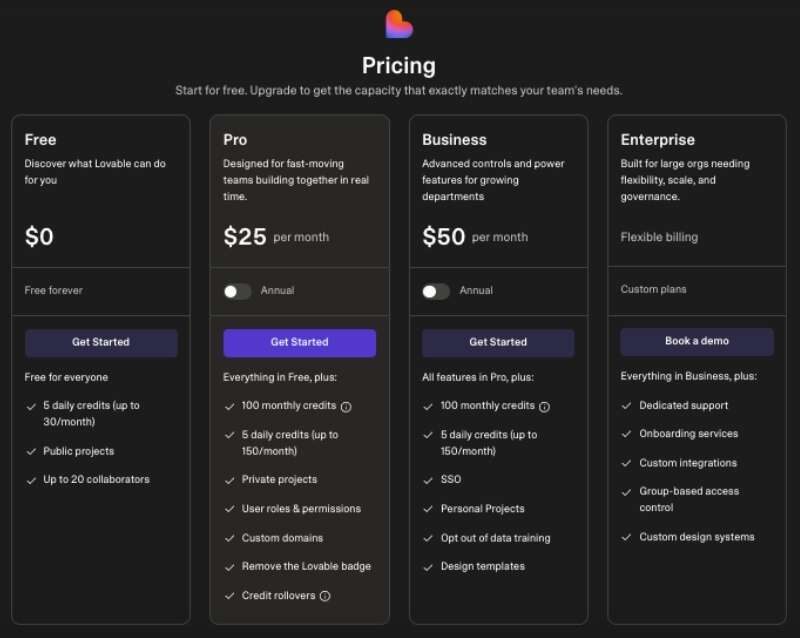 Lovable looks affordable at a monthly level, but credit usage is where costs can creep up. Frequent regeneration of features, layouts, or logic consumes credits quickly. Teams that rely heavily on iteration should plan usage carefully instead of treating credits as unlimited.
